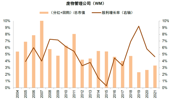 充足现金流+积极回馈股东是非成长股走出长牛的重要路径。除了可口可乐和宝洁等消费龙头以外,美股公用事业、铁路等行业同样存在一批具备垄断优势,现金流充裕且积极回馈股东的长牛公司,即使成长性不佳,但仍然受到投资者高度青睐而走出长牛趋势。例如美国的国际环保巨头——废物管理公司(Waste Management,简称WM)为例,公司主营垃圾的收集、转运和填埋,自2005年-2021以来营收水平基本没有明显增长,但由于公司拥有地方管理机构批准的垃圾处理的许可,各种时长的协议兼具保证了公司长期拥有稳定的收入和现金流。2000年以来公司股价实现16倍涨幅,年复合收益率高达13%,其中公司的股息率同样维持在2%-4%左右的水平,若包括股票回购考虑在内,(分红+回购)/总市值则长期大于4%。