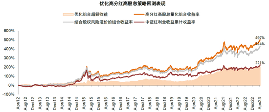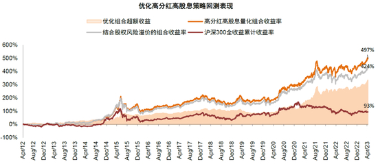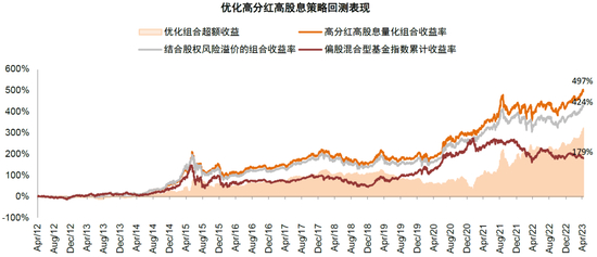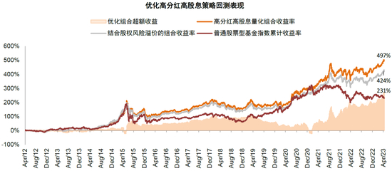 基于市场股权风险溢价进一步优化。在前期优化策略的基础上,我们进一步基于市场的估值和股权风险溢价对策略进行优化,例如2015年和2021年调仓点的股权风险溢价偏低,我们分别将选股的股息率标准上调1个百分点(金融高于6%和非金融高于4%),而在2014年的股权风险溢价高位,我们将选股的股息率标准下调1个百分点(金融高于4%和非金融高于2%),优化后组合收益率进一步上升至497%,其中在市场大幅回撤阶段起到一定的防御效果;并且以2012年和2016年为起点均在市场同期主动偏股型基金排名前10%。