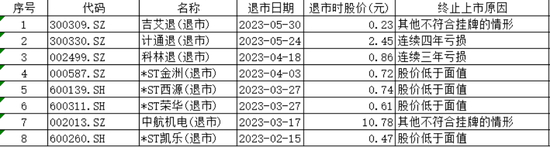 Wind(万得)数据显示,今年以来已经有8家上市公司因为触发退市规则完成退市程序。与以往相比,因股价低于面值而退市的上市公司达到4家,2022年全年该类退市公司仅1家,步入2023年,因触发面值规则而退市的公司数量大幅增加。