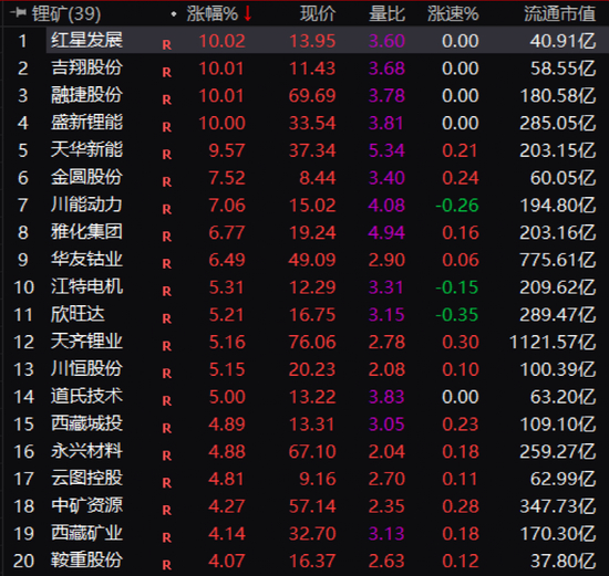 持续下挫了快一年,A股有色的锂矿股也大幅上升,红星发展、吉翔股份、融捷股份、盛新锂能等纷纷涨停。锂电巨头宁德时代也大涨2.53%。