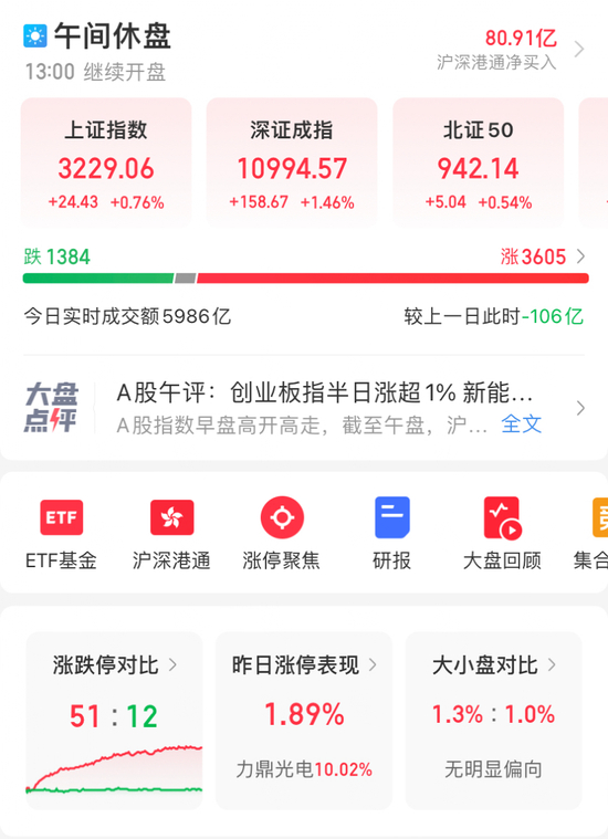 A股港股主要指数全线上扬,上证指数早盘高开后一路震荡攀升,上午收涨0.76%,深证成指涨1.46%,创业板指数涨1.43%,科创50指数涨0.39%,个股普涨,3605只上涨,1384只下跌;成交额5986亿元。