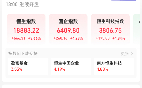 港股掀起更猛烈反弹,恒生指数涨3.66%,恒生科技指数暴涨接近5%。腾讯大涨近5%,美团涨近6%。