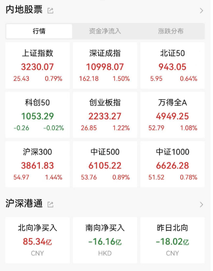 两市共3400只个股上涨,1599只个股下跌。北向资金净买入85亿元。