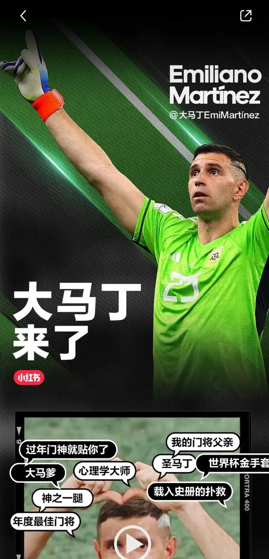 尽管不如梅西在中国的人气高,但门将大马丁同样是阿根廷夺得世界杯冠军的肱股之臣。就在淘快官宣与梅西的联动之时,小红书悄无声息地宣布阿根廷门将大马丁入驻小红书,并将在第二天上午9点进行线下见面会直播。