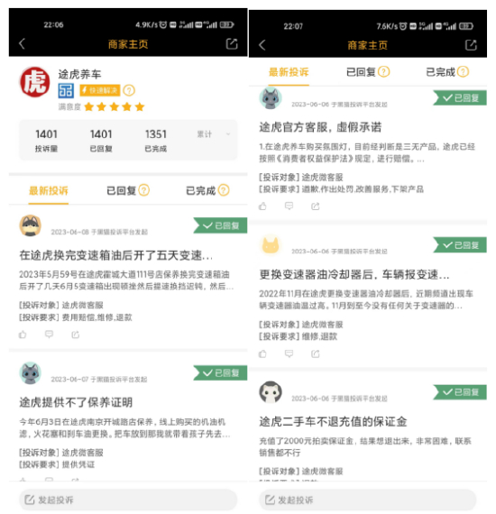 在黑猫投诉上,截至6月7日,途虎养车已经累计有1387条投诉,消费者不满意的地方主要集中在客服态度恶劣、偷工减料等等。招股书还显示,途虎养车的复购率已经从2021年6月末的62.5%下降至2021年末的60.7%。