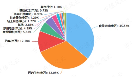 同时,申万一级行业分类下,除食品饮料占35.5%外,医药生物、汽车也占了很大权重,合计为44.1%。