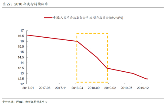 2018年7月开始,政策基调开始边际微调。2018年,美联储连续加息、全球市场大跌、国内企业融资困难、经济持续回落、投资者信心萎靡之下,股市持续回落。2018年7月政治局会议提出“经济运行稳中有变”,要求做好“稳就业、稳金融、稳外贸、稳外资、稳投资、稳预期”,10月政治局会议进一步强调“经济下行压力有所加大,部分企业经营困难较多,长期积累的风险隐患有所暴露”,要求坚持“两个毫不动摇”,促进多种所有制经济共同发展,研究解决民营企业、中小企业发展中遇到的困难。10月20日出台个税专项抵扣,此后国务院、发改委又连续发文扩基建、促消费。与此同时,针对股市下跌的连锁风险,监管层也通过设立专项纾困资金、修订《公司法》鼓励回购、推动券商、保险、私募、地方政府等各方力量联手维稳市场等方式进行化解。央行也持续通过降准等措施投放流动性。