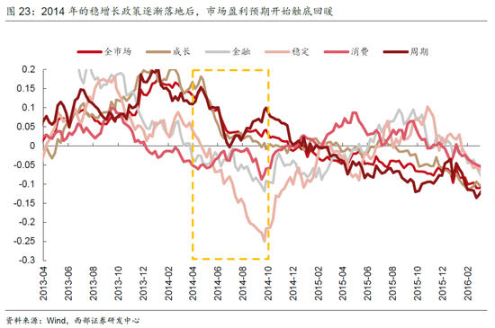 2014年4月稳增长政策出台后,盈利预期开始触底回暖。从市场微观层面来看,2014年4月稳增长政策出台后,分析师对于个股的盈利预期整体开始由负转正,从风格上来看,周期风格盈利预期最为乐观,体现出市场对于周期行业底部反转的信心。
