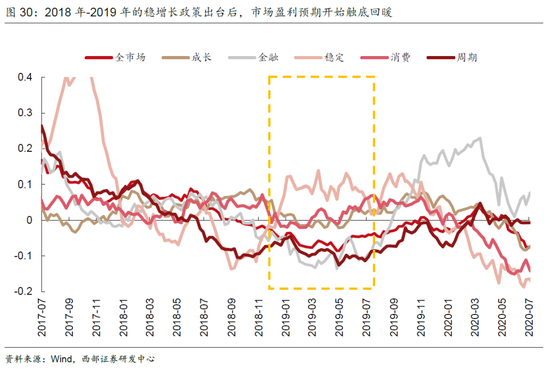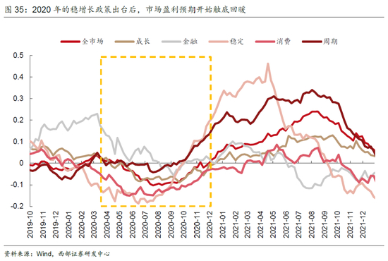 2020年4月稳增长政策出台后,盈利预期开始边际回暖。从市场微观层面来看,2020年4月稳增长政策出台后,分析师对于个股的盈利预期整体开始边际回暖,从风格上来看,周期和稳定风格盈利预期最为乐观,体现出市场对于周期行业底部反转的信心。