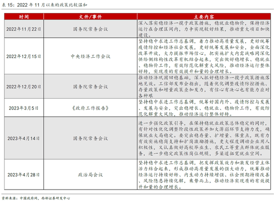 2022年底以来出台的一系列政策力度较为温和。2022年11月以来一系列稳增长政策出台。2023年初经济数据迎来开门红,4月的政治局会议并未对稳增长政策进行加码,2023年上半年政策较为中性。