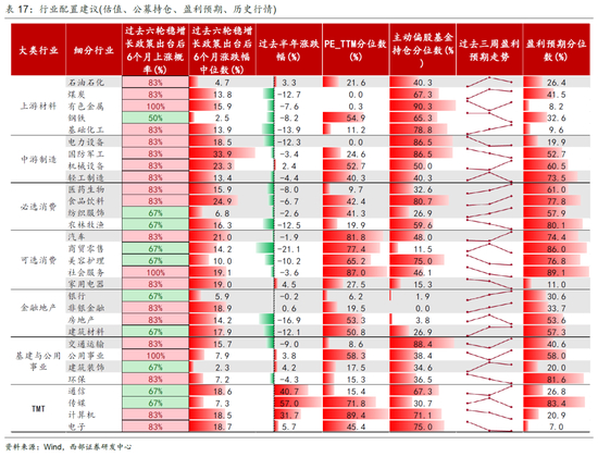 综合估值、公募持仓、盈利预期、历史行情来看,行业层面建议配置:地产链上的建材,建筑、轻工等行业;具备明显估值优势的银行、非银金融、建筑、电力、石油石化等行业央企;与经济修复相关度较高的汽车(含新能源车)、食品饮料、交运;有望困境反转的医药、家电等。