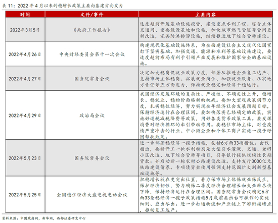 为应对疫情反复、俄乌冲突等事件冲击,2022年4月29日,中央政治局会议强调稳增长。会议对经济形势的判断从两会的“我国发展面临的风险挑战明显增多”变更为“我国经济发展环境的复杂性、严峻性、不确定性上升,稳增长、稳就业、稳物价面临新的挑战”。会议提出要加大宏观政策调节力度,扎实稳住经济,对受疫情严重冲击的行业、中小微企业和个体工商户实施一揽子纾困帮扶政策。