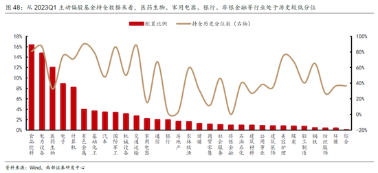 医药生物、家用电器、银行、非银金融等行业公募持仓比例处于历史较低分位数,具有较大修复空间。从2023年一季度主动偏股基金持仓比例来看,消费板块的医药生物(11.98%)、家用电器(2.14%)、纺织服装(0.35%)等行业持仓比例分别处于历史较低的32.6%分位数、15.3%分位数和26.9%分位数,顺周期板块的银行(1.93%)、非银金融(0.90%)、房地产(1.63%)、建筑材料(0.89%)等行业持仓比例分别处于历史较低的1.9%分位数、0%分位数、3.8%分位数和26.9%分位数,主动偏股基金持仓比例仍有较大修复空间。