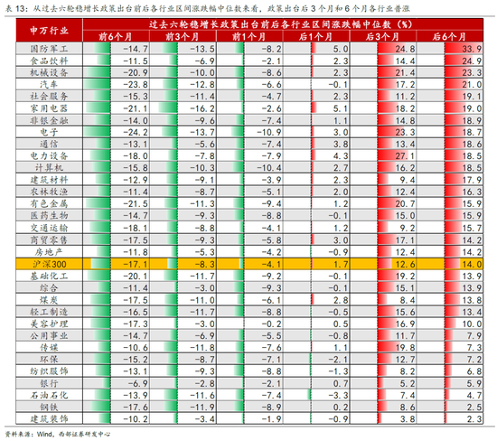 从具体行业来看,国防军工和食品饮料领涨。统计过去六轮稳增长政策出台前后各行业区间涨跌幅中位数,6个月内涨幅排名前五的行业为国防军工(33.86%)、食品饮料(24.91%)、机械设备(23.3%)、汽车(21.01%)和社会服务(19.09%)。
