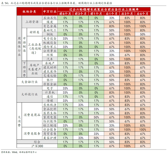 启示四:从上涨概率来看,地产链与必选消费上涨的确定性最强:统计过去六轮稳增长政策出台前后各行业上涨概率,可以发现政策出台后6个月内地产链与必选消费板块上涨概率普遍接近100%,上涨的确定性最强。