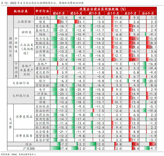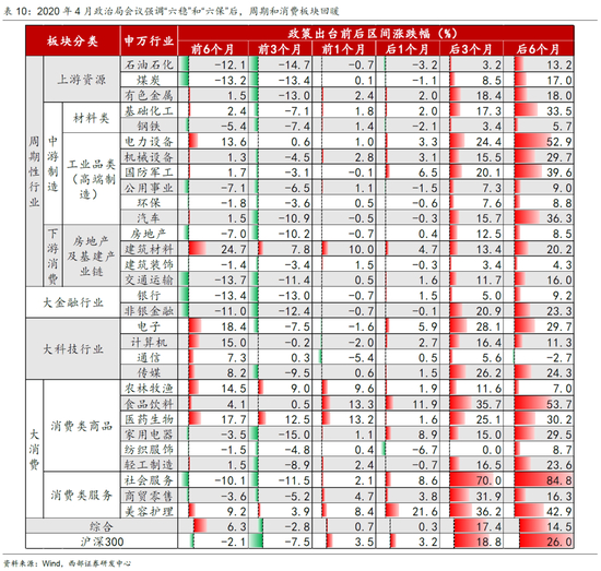 随着经济复苏由预期转向现实,股市涨幅不断扩大。2020年4月政治局会议强调“六稳”和“六保”后,市场开始有所反应,政策出台后1个月内,多数行业小幅上涨,随着稳增长政策逐渐落地,经济景气度回暖,经济复苏得到验证,政策出台后3个月和6个月内,各行业普遍上涨,其中,周期和消费板块涨幅较大。