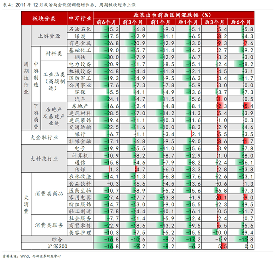第二,稳增长政策出台后,股市往往不会立刻做出反应:从过去几轮行情来看,稳增长政策出台后1个月内,市场涨幅往往较小,政策出台后3个月和6个月内,随着稳增长政策的落地和经济复苏得到验证,各行业才开始普涨。