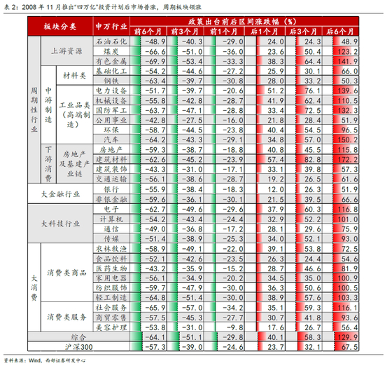 经济复苏由预期转向现实,推动股市涨幅扩大。2008年11月推出“四万亿”投资计划后,市场信心受到提振,各行业普涨,随着稳增长政策逐渐落地,经济景气度回暖,经济复苏得到验证,各行业涨幅也逐渐扩大,政策出台后6个月的区间涨幅普遍超过50%。其中,周期板块领涨,房地产、建材、有色金属、电力、煤炭等行业涨幅均超过100%。