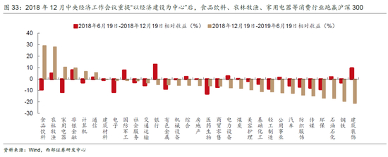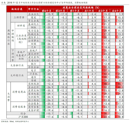 随着经济复苏由预期转向现实,股市逐渐开始上涨。2018年12月中央经济工作会议重提“以经济建设为中心”后,市场开始有所反应,政策出台后1个月内,部分行业小幅上涨,随着稳增长政策逐渐落地,经济景气度回暖,经济复苏得到验证,政策出台后3个月和6个月内,各行业普遍上涨,其中,消费板块涨幅较大。