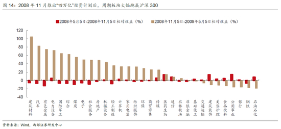 从相对收益角度来看,周期板块普遍跑赢大盘。以沪深300为基准,对比各行业在稳增长政策出台前六个月和后六个月的相对收益,可以发现,政策出台前六个月内,周期板块普遍跑输大盘,而政策出台后六个月,周期板块大幅跑赢大盘。究其原因,2008年的稳增长政策主要以基建为抓手,因此稳增长政策带动经济复苏后,顺周期行业最为受益。