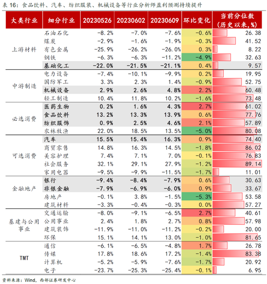 食品饮料、汽车、机械设备等行业盈利预期持续上调,顺周期行业盈利预期仍有较大修复空间。从分析师盈利预测指标来看,消费板块的食品饮料、医药生物、纺织服装、汽车等行业过去三周的盈利预期持续上调,且预期修正已经达到历史较高水平,顺周期板块的基础化工、机械设备、银行、非银金融的盈利预期也持续上调,但是仍处于历史较低分位,盈利预期仍然有较为明显的修复空间。