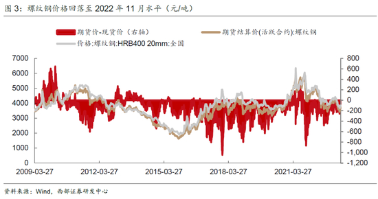 螺纹钢价格降至2022年11月水平。作为最主要的国内定价大宗商品,螺纹钢期货价格及其与现货价格升贴水也反映了商品市场对于经济的预期。从当前的螺纹钢价格来看,截至2023年6月14日,螺纹钢HRB40020mm价格已经降至3855元/吨,低于去年11月底的3946元/吨,而期货活跃合约价格3738元/吨也低于去年11月底的3745元/吨。虽然期货贴水略有收敛,但整体仍然处于2022年12月以来低位。