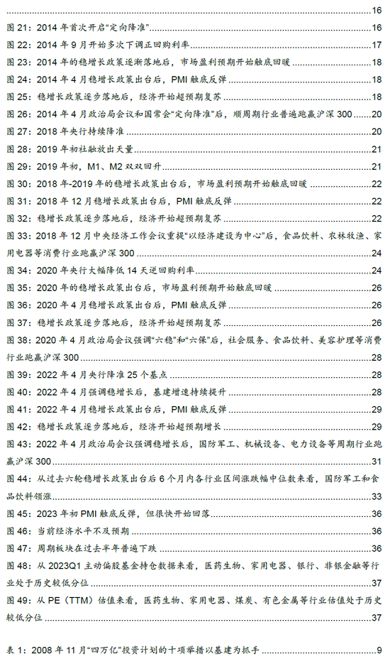 布局顺周期行业正当时。我们在2022年9月25日报告《四季度还有哪些风险需要关注》中指出,“市场正在迎来最艰难的时刻,11月中旬有望迎来大级别底部”,耐心等待三季报后的“价值搭台,成长唱戏”。10月30日报告《底部临近,左侧布局》指出,“当下已是黎明前最后的黑暗,布局估值切换行情的窗口正在打开。” 11月26日报告《今年的跨年行情与往年会有哪些不同》,提示“今年的跨年行情更晚,更强,更价值”。12月25日报告《跨年行情仍在途中,积极因素正在积聚》,中指出“短期经济扰动接近极致,市场盈利预期正在向远期切换”。1月3日报告《当下仍是有为期》中指出“跨年行情有望进入第二阶段,市场风格转向均衡。” 在报告《2023年A股“钱”从何处来?》中提出,“险资、外资等机构资金仍是主要增量来源。”在1月15日报告《持股过年》中明确提出,“节后市场有望迎来跨年行情的第三阶段。”在2月2日报告《外资先行,内资有望接棒》中指出,“2月内外资有望合力,推动A股延续修复行情。”在2月12日报告《当下市场与2019年的异与同》提出“2023年市场是2019年节奏与2017年风格的结合”。在2月19日报告《以防御的姿态进攻》中指出,“跨年行情接近尾声,蓝筹股仍有最后一涨”。在3月4日报告《“跨年行情”完美谢幕》中提示,“政策预期全面兑现,流动性预期转向中性,市场关注点重回基本面”。在3月12日报告《迎接价值投资的回归,短久期资产时代正在到来》中提示,“外部冲击影响有限,国内经济复苏仍是主要矛盾”。在3月26日报告《耐心等待基本面的回归》中指出,“极致拥挤的交易后,市场核心矛盾将重回分子端”。在4月9日报告《事情正在发生变化》中指出,“国内外流动性预期整体修正”,“市场中枢的上移仍然需要等待5月”,但另一方面“内需持续修复,不宜低估复苏动能”,“存量博弈下资金分歧已接近极致,关注中特估接力行情。”4月16日报告《仍是整固期,耐心等待基本面回归》中强调,市场盈利预期短期仍有下修压力。随着近期大类资产价格的快速调整,我们认为市场经济预期的修正已经接近尾声,顺周期行业的布局窗口正在打开。5月21日报告《“弱复苏”预期是否已经充分定价》中强调,资产价格所蕴含的经济预期已经开始低于实际的经济修复进度,未来市场对于复苏再定价的矛盾正在凸显,关注顺周期行业的左侧布局机会。