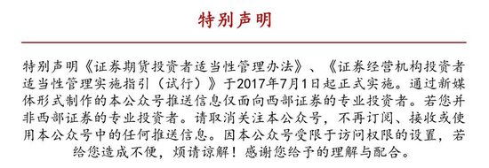 本公众号推送内容仅面向西部证券股份有限公司(以下简称“西部公司”)机构客户,请勿对本公众号内容进行任何形式的转发。若您并非西部证券机构客户,请取消关注本公众号,不再订阅、接收或使用本公众号中的内容。因本公众号难以设置访问权限,若给您造成不便,烦请谅解!西部证券不会因订阅本公众号的行为或者收到、阅读本公众号推送内容而视相关人员为客户。本公众号内容基于已公开的信息编制,但作者对该等信息的真实性、准确性及完整性不作任何保证。本公众号所载的意见、评估及预测仅为出具日的观点和判断,该等意见、评估及预测在出具日外无需通知即可随时更改。在不同时期,西部证券可能会发出与本公众号所载意见、评估及预测不一致的研究报告。同时,本公众号所指的证券或投资标的的价格、价值及投资收入可能会波动。西部证券不保证本公众号所含信息保持在最新状态。对于西部证券其他专业人士(包括但不限于销售人员、交易人员)根据不同假设、研究方法、即时动态信息及市场表现,发表的与本公众号不一致的分析评论或交易观点,西部证券没有义务向本公众号所有接收者进行更新。西部证券对本公众号所含信息可在不发出通知的情形下做出修改,投资者应当自行关注相应的更新或修改。在任何情况下,本公众号所载的观点、结论和建议仅供投资者参考之用,并非作为购买或出售证券或其他投资标的的邀请或保证。客户不应以本公众号取代其独立判断或根据本报告做出决策。该等观点、建议并未考虑到获取本报告人员的具体投资目的、财务状况以及特定需求,在任何时候均不构成对客户私人投资建议。投资者应当充分考虑自身特定状况,并完整理解和使用本公众号内容,不应视本公众号为做出投资决策的唯一因素,必要时应就法律、商业、财务、税收等方面咨询专业财务顾问的意见。西部证券以往相关研究报告预测与分析的准确,不预示与担保本公众号及西部证券今后相关研究报告的表现。对依据或者使用本公众号及西部证券其他相关研究报告所造成的一切后果,西部证券及作者不承担任何法律责任。本公众号版权仅为西部证券所有。未经公司书面许可,任何机构或个人不得以翻版、复制、发表、引用或再次分发他人等任何形式侵犯本公众号版权。如征得西部证券同意进行引用、刊发的,需在允许的范围内使用,并注明出处为“西部证券研究发展中心”,且不得对本公众号进行任何有悖原意的引用、删节和修改。如未经西部证券授权,私自转载或者转发本公众号,所引起的一切后果及法律责任由私自转载或转发者承担。西部证券保留追究相关责任的权力。本公司具有中国证监会核准的“证券投资咨询”业务资格,经营许可证编号为:91610000719782242D。