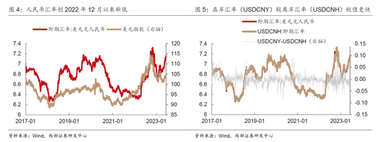 人民币汇率短期波动进一步加剧。近期在美元指数维持震荡的环境下,人民币汇率短期波动持续加大,在岸人民币兑美元汇率再次“破7”,截至6月14日报7.1576,超过2022年11月30日的7.1419,达到去年12月以来的高点。在岸汇率相较于离岸汇率更快的贬值,也反映了离岸资金预期的变化。