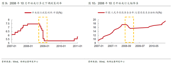 直到2008年11月“四万亿”计划出台后,A股开始止跌企稳,周期板块大幅上涨。11月5日,政府宣布实施适度宽松的货币政策和积极的财政政策,出台十项措施刺激经济,A股开始蓄力反弹。11月10日“四万亿”正式推出,沪指大涨7.3%。11月12日,国务院常务会议又决定出台扩大内需、促进增长的四项实施措施。11月27日,央行大降利率1.08%,同时下调准备金率。这是自9月份以来第四次降息,力度超预期。11月28日,中共中央政治局召开会议,提出要把保持经济平稳较快发展作为下一年经济工作的首要任务。12月4日,国务院“金融国九条”出台,提及稳定股票市场。12月8日,国务院办公厅就金融促进经济发展提出30条意见,以高于GDP增长与物价上涨之和约3-4个百分点的增长幅度作为2009年货币供应总量目标。