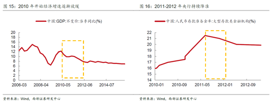 2011年,经济呈现“低增长、高通胀”的特点,年末政治局会议定调稳增长。随着“四万亿”计划刺激效果逐渐消退,2010年后我国经济增速开始逐渐放缓,至2011Q3-Q4实际GDP增速已下滑至10%以下并持续回落。为了应对经济下行以及2011年10月份以后快速发酵的欧债危机,央行政策开始逐渐微调,暂停发行三年期央票,并连续通过逆回购、央票到期等方式提供流动性。一年期央票发行利率也适当下调。11月30日又宣布于12月5日下调存款准备金率0.5个百分点。2011年12月政治局会议对政策的定调,由此前的“管理通胀预期、调整经济结构和保持经济平稳较快发展”转为“保持经济平稳较快发展、调整经济结构和管理通胀预期三者关系”,将经济增长放到更核心的位置。