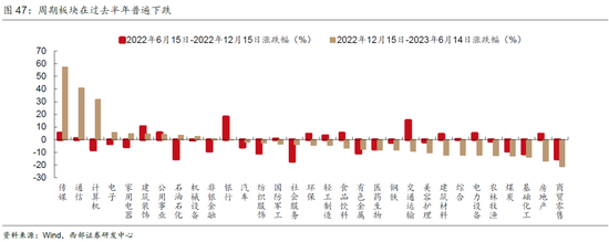 顺周期行业具有较大修复空间。过去半年TMT行业表现领先,而顺周期行业和消费行业已经一定程度上消化了对经济的悲观预期。7月政治局会议临近,加码稳增长政策的预期不断增强,在基准假设下,未来一系列稳增长政策出台并落地,带动经济复苏,当经济复苏得到验证后,顺周期行业有望迎来底部反转。