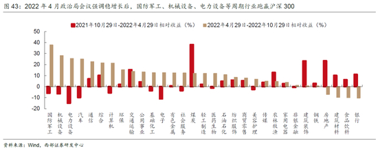 从相对收益角度来看,部分消费和周期行业跑赢大盘。以沪深300为基准,对比各行业的相对收益,可以发现,政策出台后六个月,国防军工、机械设备、电力设备等周期行业大幅跑赢大盘,究其原因,由于2022年一季度受到疫情反复和俄乌冲突的影响,稳增长政策主要向基建方向发力,因此稳增长政策带动经济复苏后,周期行业相对更加受益。