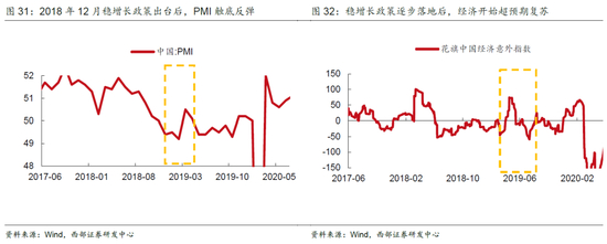 随着政策落地,景气回暖,经济复苏得到验证。随着2018-2019年稳增长政策的逐步落地,经济数据开始回暖,制造业PMI触底反弹,快速回到荣枯线以上,经济景气水平回暖。此外,花旗中国经济意外指数由负转正,反映经济超预期复苏,稳增长政策出台时的经济复苏预期得到验证。