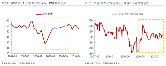 随着政策落地,经济复苏预期得到验证。随着“四万亿”投资计划的逐步落地,经济数据开始回暖,制造业PMI触底反弹并快速回到荣枯线以上,反映经济景气向好。此外,花旗中国经济意外指数由负转正,稳增长政策出台时的经济复苏预期得到验证。