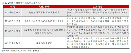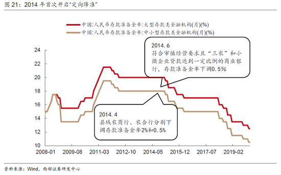 2014年政策边际宽松,提出针对涉农资金的“定向降准”。2012年底经济实现“软着陆”,2013年全年货币政策定力维持较强定力,年中“钱荒”后,社融增速开始快速回落,企业融资状况恶化。至2013年四季度,国内经济下行压力再次加大,企业盈利开始回落。针对这样的情况,到2014年,持续收紧的货币政策开始转向。2014年4月16日召开的国务院常务会议提出,要加大涉农资金投放,对符合要求的县域农村商业银行和农村合作银行适当降低存款准备金率。人民银行宣布从2014年4月25日起下调县域农村商业银行人民币存款准备金率2个百分点,下调县域农村合作银行人民币存款准备金率0.5个百分点。以2014年4月份国务院常务会议提出的“定向降准”为起点,货币政策宽松周期正式开始,这也是后续牛市的重要推动力。