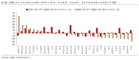 从相对收益角度来看,部分消费和周期行业跑赢大盘。以沪深300为基准,对比各行业的相对收益,可以发现,政策出台后六个月,社会服务、食品饮料、美容护理等消费行业以及电力设备、国防军工、汽车、化工等顺周期行业跑赢大盘,究其原因,由于2020年初经济受到严重冲击,稳增长政策同时向消费和基建方向发力,因此稳增长政策带动经济复苏后,消费和周期行业相对更加受益。