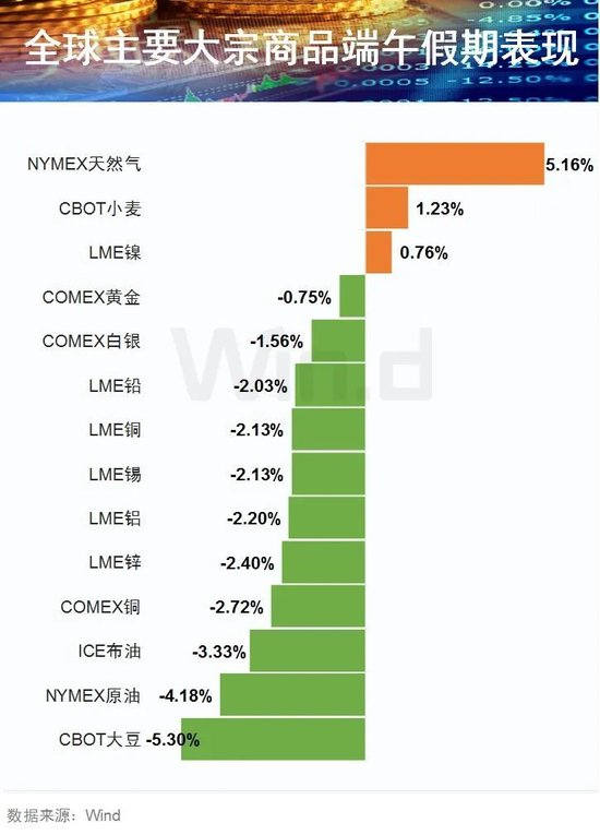 端午假期,全球主要大宗商品表现也不佳,除了NYMEX天然气、CBOT小麦和LME镍三个品种上涨以外,其余11个品种出现下跌,占比为78.6%。其中NYMEX天然气大涨5%以上遥遥领先,而NYMEX原油、CBOT大豆跌幅较大,均超过4%。