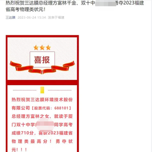 6月24日,科创板上市公司三达膜官微发布喜报称,热烈祝贺三达膜总经理方富林千金、双十中学方某某勇夺2023福建省高考物理类状元!