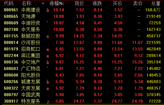 地产板块今日强势拉升,截至收盘,中南建设、天地源、中迪投资、中天服务、新城控股等涨停,沙河股份、招商蛇口涨约7%。