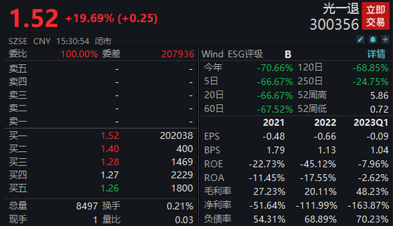 因触及财务类退市指标被深交所终止上市的光一退在退市整理期已连续3个交易日“20cm”涨停板,截至今日收盘,该股报1.52元,涨停板上封单超20万手,最新市值6.2亿元。