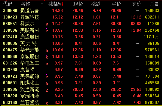 氢能概念走势活跃,截至收盘,蜀道装备“20cm”涨停,昇辉科技涨超15%,蜀道装备涨超13%,科威尔、美联新材涨逾10%,康盛股份、英力特、华光环能、京城股份、美锦能源等涨停,亿华通涨约8%。