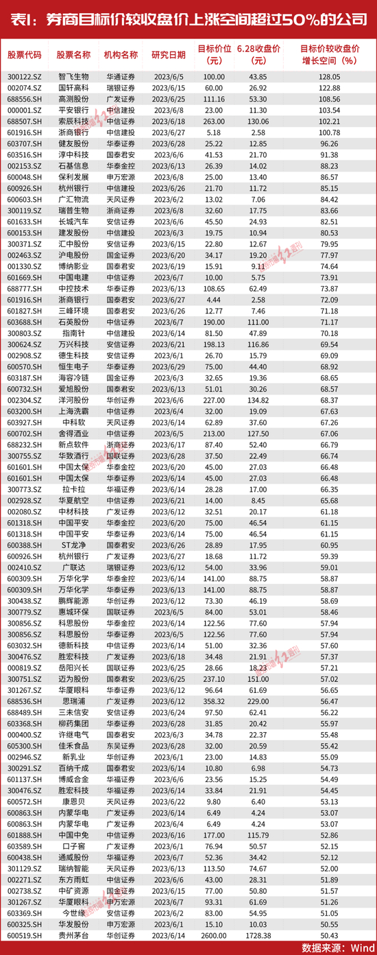 从券商预测情况来看,进入6月份以来,已有640家公司被券商给出了买入评级,但明确了目标价的只有324家公司。将公司最新收盘价与目标价进行对比,有73家公司券商预判未来股价有望较目前增长超过50%(见表1)。