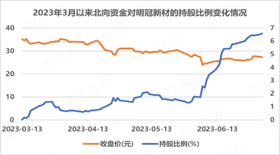 明冠新材股价从2022年9月一路回调,到今年三月份已近腰斩,随后北向资金开始关注并小幅买入,在6月6日其股价跌到阶段性低点22.99元/股时,北向大举加仓,截至7月4日,持有流通股比例已上升至6.59%。