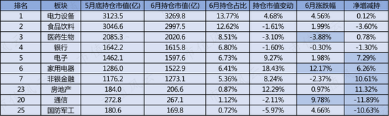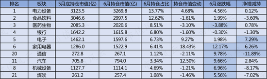 6月北向资金持仓市值前五大板块没有发生变化,仍是电力设备、食品饮料、医药生物、银行和电子,合计持仓1.15万亿。剔除板块涨跌幅影响,前5大板块中对食品饮料减仓幅度最大,其次对银行板块也减了仓。