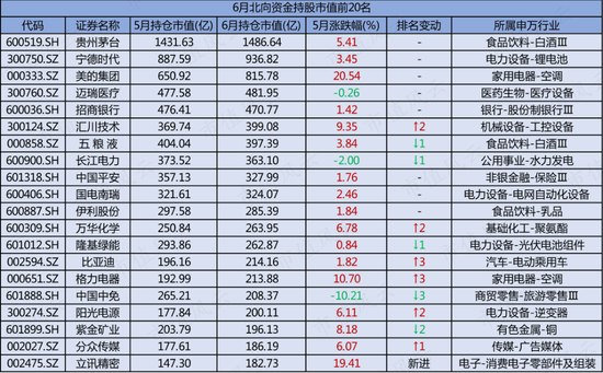 6月末,北向资金持有的前20大个股总市值为8217亿,占其持仓总市值的35%。得益于前20大6月表现亮眼,平均上涨4.8%,持仓市值环比增长了264亿,但北向其实对13只个股都进行了减仓。
