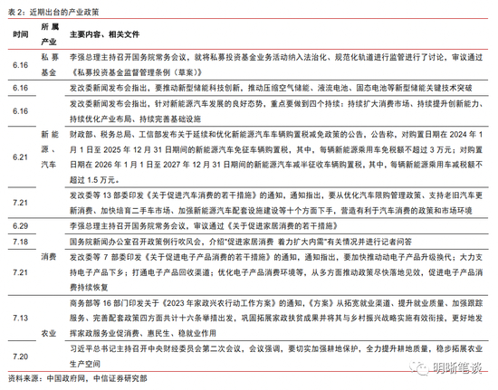 产业政策:聚焦新能源车、AI及消费。今年4月召开的政治局会议上重点提及新能源车和人工智能两个领域。7月13日,国家网信办等七部门联合公布《生成式人工智能服务管理暂行办法》。相比于4月发布的征求意见稿,此次发布的暂行办法体现出对人工智能产业创新发展开放、鼓励的态度。近期国家发改委也出台多项文件,推动促进汽车以及电子产品等领域消费的措施。