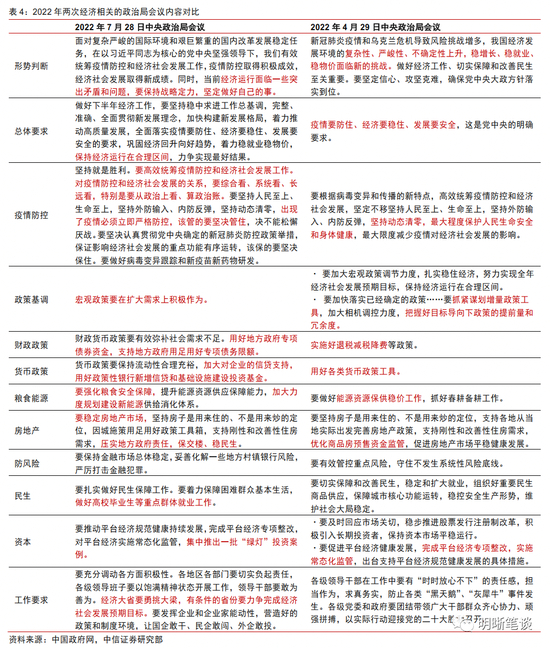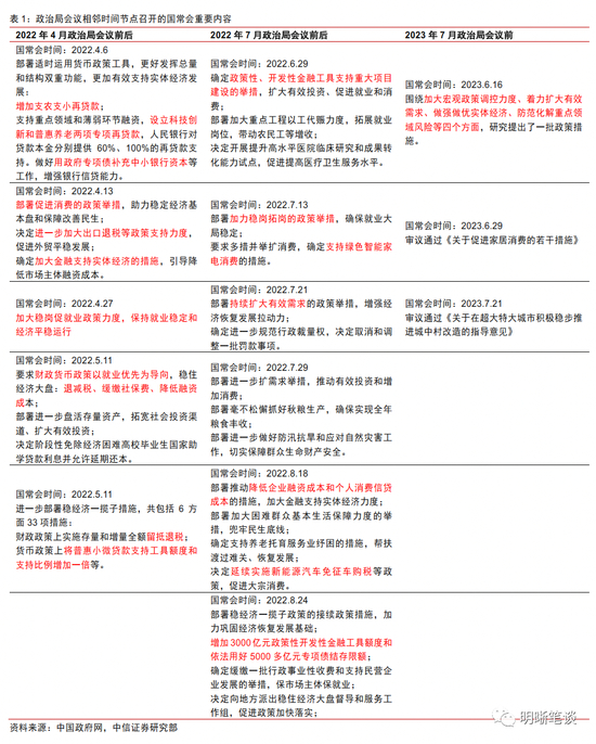政治局会议的通稿大多会给出框架性的政策导引,而不会提出具体的政策措施,但是政治局会议召开时点附近的国务院常务会议上则有可能会涉及具体的政策措施。2022年4月召开的几次国常会上,分别提及支农支小再贷款以及科技创新和普惠养老专项再贷款等结构性货币工具增量扩新、进一步加大出口退税、以及加大金融支持实体经济力度。同年5月的国常会上则明确财政货币政策以就业优先为导向:退减税、缓缴社保费、降低融资成本。2022年6月29日召开的国常会上决定,运用政策性、开发性金融工具,通过发行金融债券等筹资3000亿元,用于补充包括新型基础设施在内的重大项目资本金。同年8月24日的国常会提出要增加3000亿元政策性开发性金融工具额度和依法用好5000多亿元专项债结存限额。
