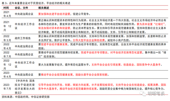 重视民营经济、平台经济的发展。7月19日,新华社发布了《中共中央 国务院关于促进民营经济发展壮大的意见》,共包括31条促进民营经济做大做优做强的具体措施。对平台经济的表述也由2021年时的“加强”监管转变为今年4月中央政治局会议上提出的“鼓励头部平台企业探索创新”。