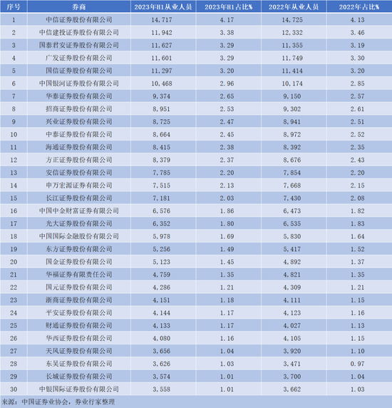 来自中国证券业协会的数据显示,截至2023年上半年,141家券商(含单列的资管子公司)共有353,123名从业人员。而在2022年底,从业人员数量为356,446名。